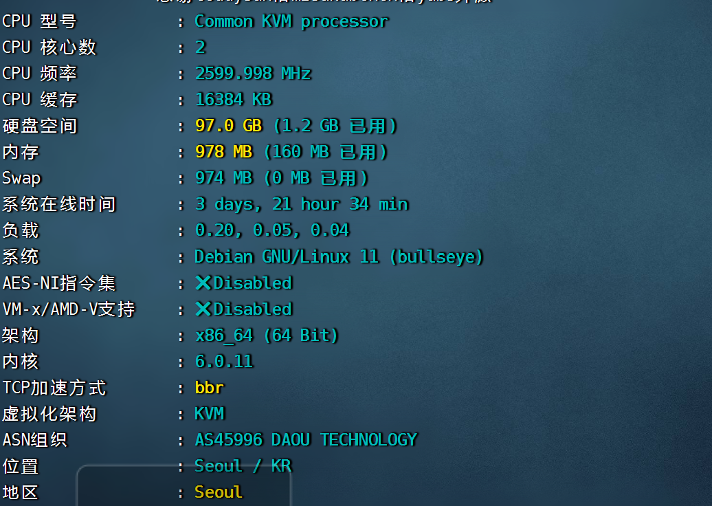 本次要测试的VPS为kdatacenter的韩国首尔机房,KVM虚拟化架构,1核心CPU、1GB内存、100GB SSD硬盘、带宽是1Gbps、1000GB流量、1个IPv4地址,支持windows和linux,一个月19刀