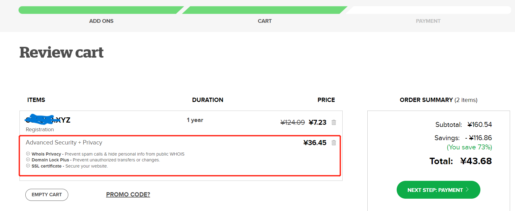 第二步注册域名,搜索6位纯数字.xyz域名,加入购物车然后结算,注意删除那个Advanced Security(安全保护服务),要不然多花钱了,这里先只注册购买一年。